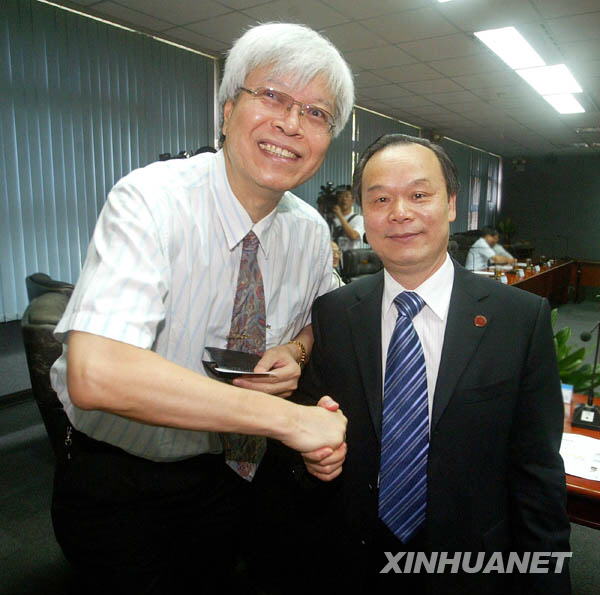2009年7月14日 北京大学校长周其凤率团拜访台湾大学 7月14日,北大校长周其凤(右)与台湾大学副校长陈泰然握手。