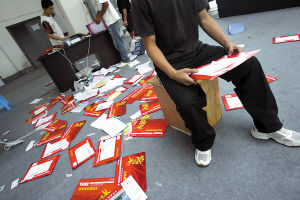 学校招生办公室的地上散乱扔着录取通知书快递包装