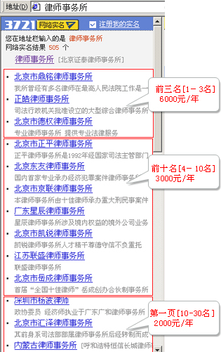 3721以全新的服务理念为您的企业网站作推广,只要注册网络排名服务,保证您的网站可以排名在3721搜索结果第一页。位置有限,时间有限,而价值无限,立即行动起来!